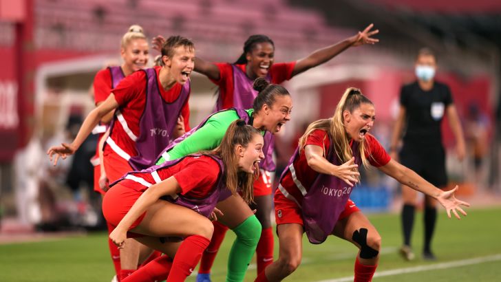 המועמדת הוודאית לזהב נכנעה 1:0 לקנדה בחצי הגמר. ג'סי פלמינג כבשה את שער הניצחון המפתיע בדקה ה-75, בגמר הראשון בתולדותיה תפגוש קנדה, לה היה זה ניצחון ראשון מזה 20 שנה על האמריקאיות, את המנצחת בין אוסטרליה ושבדיה.