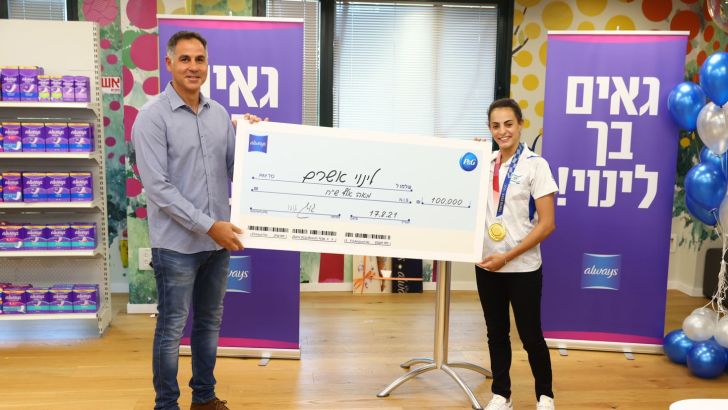 לינוי אשרם ממשיכה להכניס סכומי כסף נכבדים בעקבות זכייתה במדליית הזהב בטוקיו. המתעמלת האמנותית התארחה היום (שלישי) במשרדי פרוקטור אנד גמבל ישראל, יצרנית נותנת החסות שלה Always, שם נערכת לכבודה הרמת כוסית חגיגית שבמהלכה הוענקו לה 100 אלף שקל.