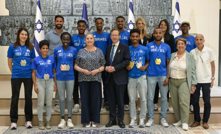 נשיא המדינה יצחק הרצוג ורעייתו מיכל אירחו היום (ראשון) את נבחרות ישראל בריצת כביש, ששבו ארצה לאחר שזכו בחמש מדליות באליפות אירופה שהתקיימה בבריסל, בלגיה.