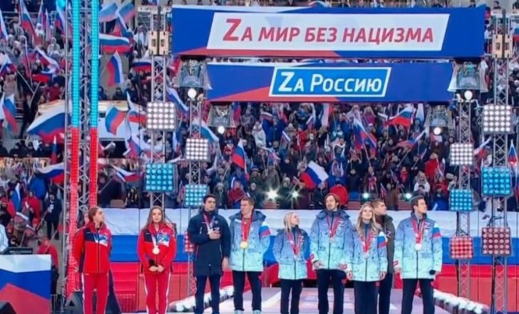המתעמלות האמנותיות היו שתי הספורטאיות המובילות מבין משלחת של ספורטאים שהשתתפו בעצרת, והביעו הזדהות ותמיכה במלחמה באוקראינה. בתיעוד מהעצרת נראית דינה אברינה עונדת את מדליית הכסף מאולימפיאדת טוקיו, והיא ואחותה התאומה מתגאות בסימון Z על החזה – שהפך לסימן ההיכר של הצבא הרוסי במלחמה.