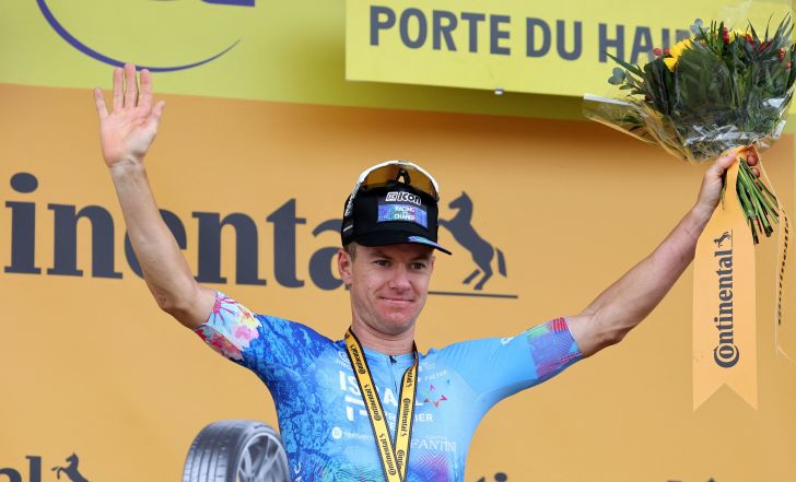 סיימון קלארק, הרוכב האוסטרלי של הקבוצה הישראלית "ישראל פרמייר טק" חוגג ניצחון אחרי הקטע החמישי, טור דה פראנס 01:36