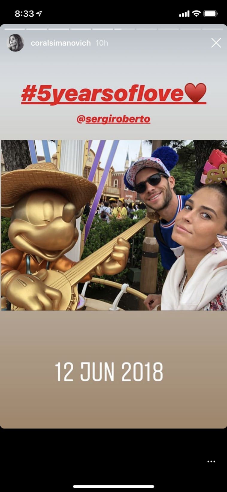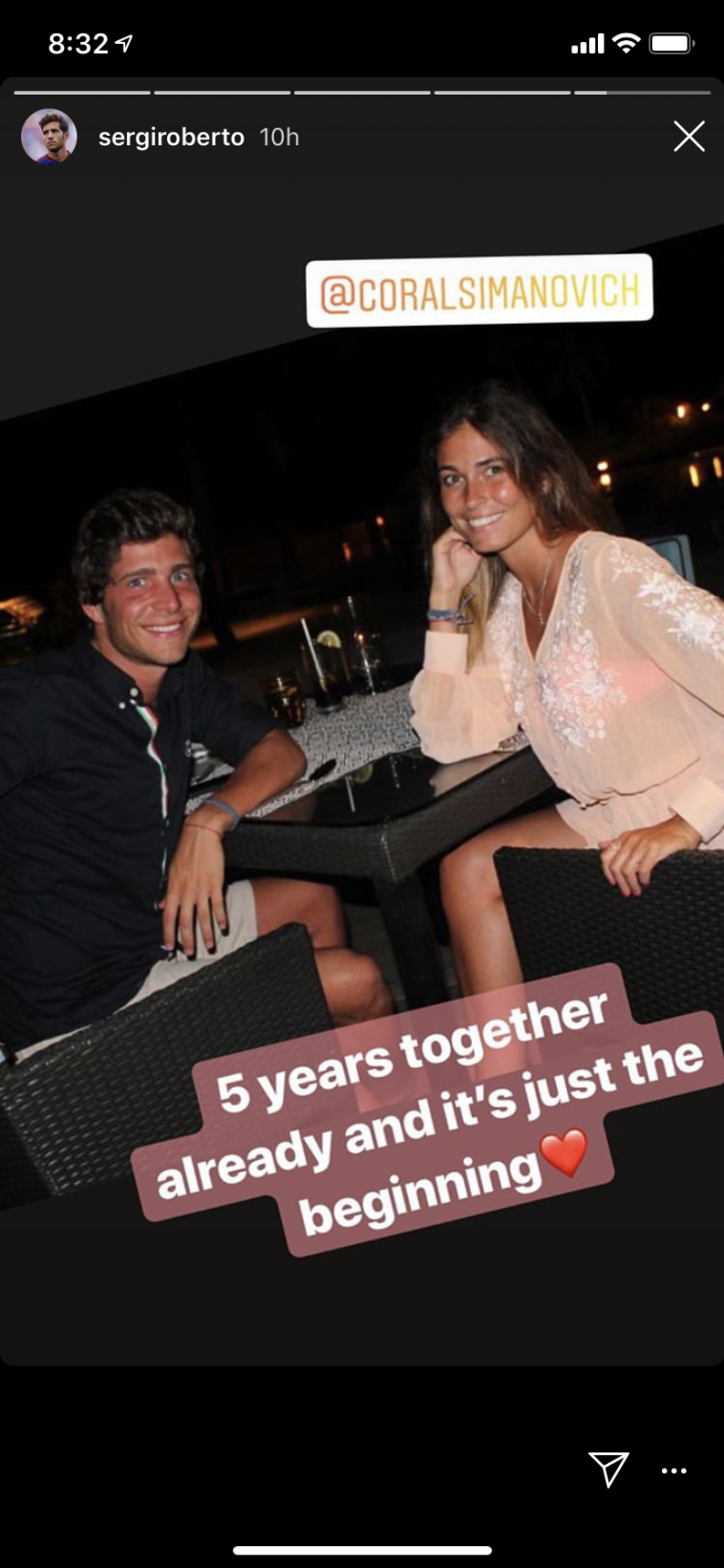 הנציגה הישראלית שלנו בקאמפ נואו והדוגמנית הבינלאומית, קורל סימנוביץ', וקשרה של ברצלונה, סרג'י רוברטו, חוגגים חמש שנות זוגיות דרך האינסטגרם. מיסס רוברטו-סימנוביץ' פירסמה בחשבון שלה שלל תמונות תחת התיוג "חמש שנים של אהבה", ואנו תוהים אם מישהו זוכר בכלל שבתחילת הקריירה שלה היא יצאה עם אחיה של בר רפאלי?! לא נראה לנו. הזוג הישראלי-קטאלוני חגג אמש (ראשון) את התאריך המרגש, אך עשה זאת בנפרד מכיוון שקורל נמצאת בארץ בימים אלו, מצטלמת כמובן לקמפיין נוסף, בעוד בעלה נמצא בשיאה של העונה עם בארסה.