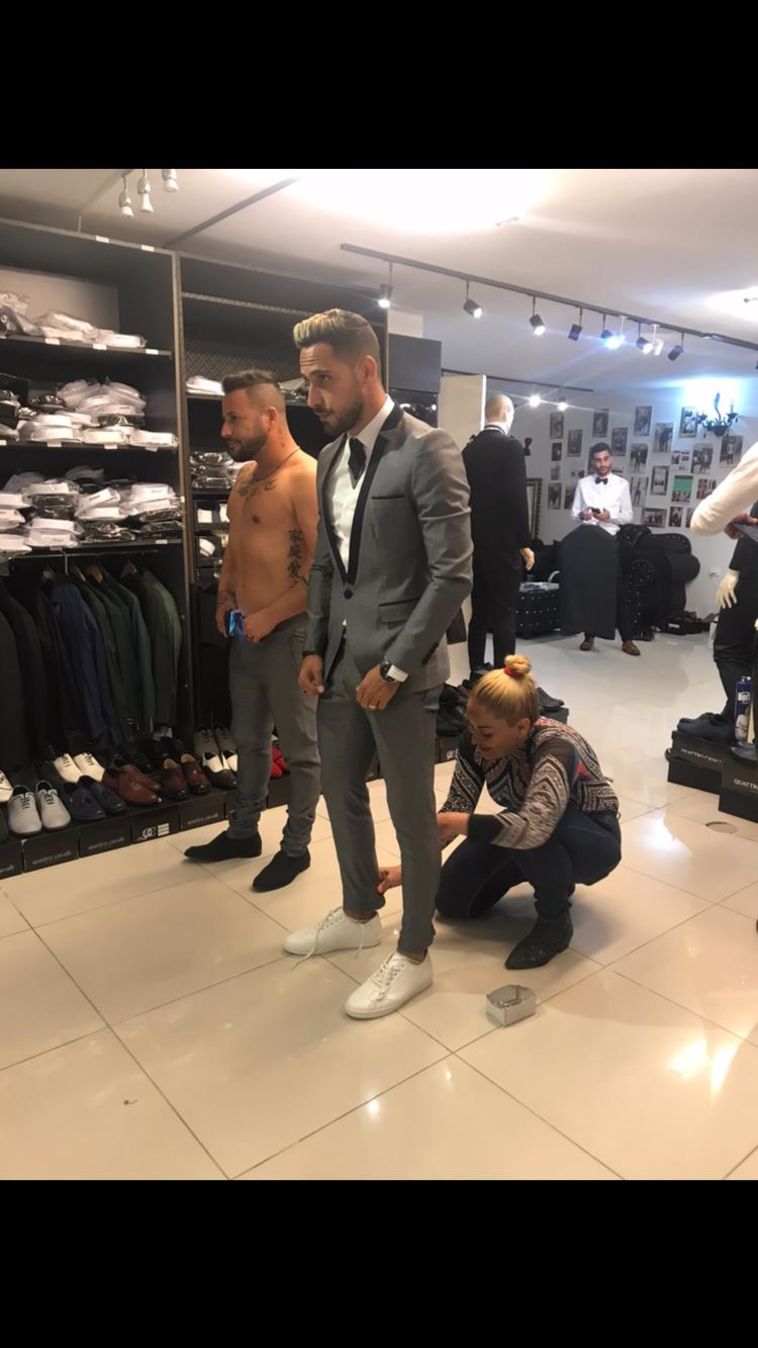 דורין סגול בפעולה מודדת את החליפה לאלמוג בוזגלו (צילום: אור גפן)