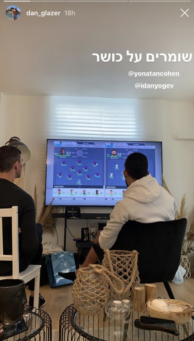 החברים הטובים ממכבי תל אביב, דן גלזר ויונתן כהן, ניצלו את יום החופש המפתיע "ושמרו על כושר" בטורניר פלייסטיישן סוער שהתקיים בדירתו של כהן בצפון תל אביב. מאוחר יותר, גלזר פגש את מספר 15 בצהוב כחול, דור מיכה, במגרש פאדבול וגם שם נהנו ממשחק המשלב בין כדורגל וטניס על מנת לשמור על הכושר וגם כמובן ליהנות.