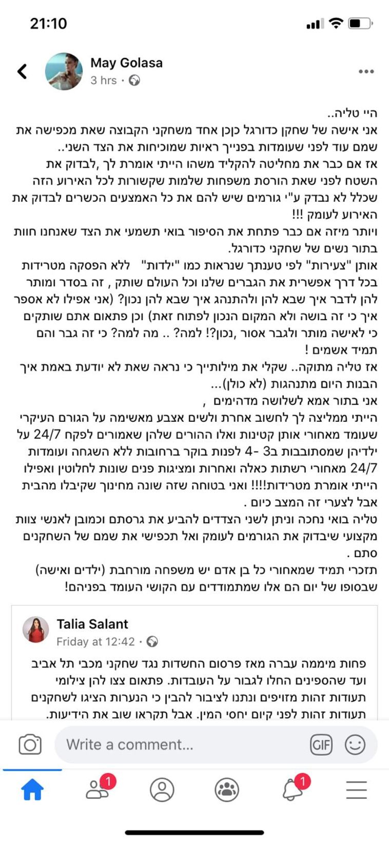 התגובה של מאי ורד בפייסבוק (פייסבוק)