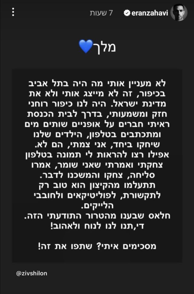 ערן זהבי, כוכב מכבי תל אביב, סיכם את התחושות שלו בנושא בכך ששיתף את הפוסט של חברו "המלך" זיו שילון, שכתב: "לא מעניין אותי מה קרה בת"א בכיפור, זה לא מייצג אותי ולא את מדינת ישראל. תתעלמו מהקיצון, הוא טוב רק לתקשורת, לפוליטיקאים ולחובבי הלייקים. שבענו מהטרור התודעתי הזה. די! תנו לנו לנוח ולאהוב!".