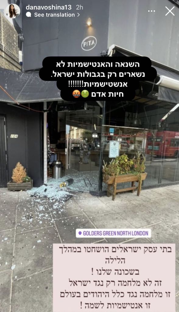 הבוקר (שני) פרסמה זוגתו של כדורגלן טוטנהאם תמונה מטרידה בחשבון האינסטגרם שלה. בפוסט שהעלתה ניתן לראות בית עסק פרוץ ושבור, כאשר היא מוסיפה את הכיתוב הבא: "השנאה והאנטישמיות לא נשארים רק בגבולות ישראל. אנטישמיות! חיות אדם!". דנה הוסיפה לכתוב ותיארה את מה שהתרחש: "בתי עסק ישראלים הושחטו במהלך הלילה בשכונה שלנו! זה לא מלחמה רק נגד ישראל זו מלחמה נגד כלל היהודים בעולם. זו אנטישמיות לשמה!". עד לאנגליה הגיעה השנאה, כפי שהיה ניתן לראות בזכות הפרסום של דנה.