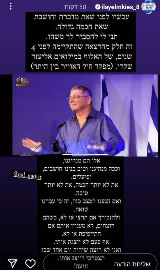 אלמקייס שיתף סטורי נוסף עם הרצאה של האלוף במילואים אליעזר שקדי, מפקד חיל האוויר לשעבר, והעביר מסר נוקב לוונדרוומן: "אלו הם מנהיגנו וככה הם חושבים ופועלים. את לא יותר חכמה או טובה. להזכירך אם תרצי או לא, כשהם רוצחים, לא מעניין אותם אם התייפיפת או לא. אף פעם לא ייצגת אותי ואני לא רוצה שיהיה יום אחד שתצטרכי לייצג אותי. זוועה", סיכם ותייג את גדות.