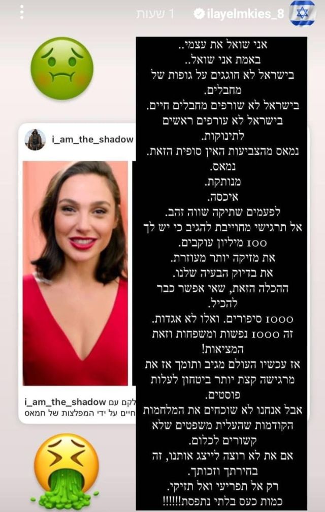 על פי הדיווחים, אמש מצאו בכפר עזה כ-40 גופות של פעוטות, חלקן עם ראש ערוף וגופות של אזרחים שהוצתו בעודם בחיים על ידי הטרוריסטים המפלצתיים. השחקנית הישראלית, לה 109 מיליון עוקבים, כתבה בסטורי שלה בין היתר: "להרוג פלסטינים חפים מפשע זה נורא. להרוג ישראלים חפים מפשע זה נורא. אם אתה לא מרגיש ככה, אני חושבת שאתה צריך לשאול את עצמך 'למה זה'?". אלמקייס שיתף את הדברים שלה וכתב: "נמאס מהצביעות האין סופית הזאת. מנותקת, איכס. לפעמים שתיקה שווה זהב".