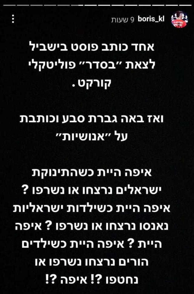 נרמין סבע גרמה לסערה גדולה אתמול (שלישי). כזכור, אשתו של דיא סבע שיתפה סטורי שטוען כי "אין הבדל בין ילד בעזה לבין ילד בישראל" וכי 800 ילדים כבר נהרגו ברצועה. לפני שישה ימים שחקן מכבי חיפה כתב בסטורי שלו ש"המראות קשים והכאב גדול, מתפללים לימים של שקט". מי שממש לא התחבר לדברים של גברת סבע הוא בוריס קליימן, שוער נבחרת ישראל לשעבר, שתקף.