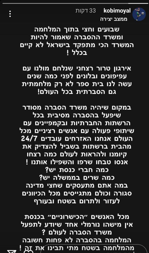 אקס בית"ר ירושלים ומכבי חיפה כתב: "שבועיים וחצי בתוך המלחמה ומשרד ההסברה שאמור להיות המשרד הכי מתפקד בישראל, לא קיים בכלל. ארגון טרור רצחני שנלחם מול עם עפיפונים ובלונים לפני כמה שנים, עשה לנו בית ספר ולא רק מלחמתית, גם הסברתית בכל העולם.
