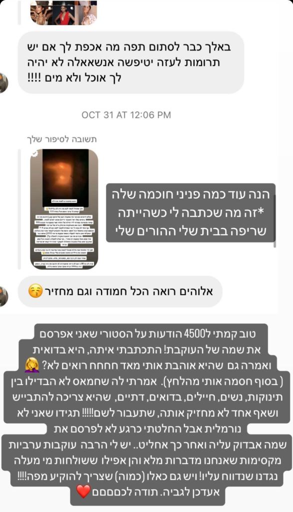 "תגידו שאני לא נורמלית, אבל החלטתי כרגע לא לפרסם את שמה. אבדוק עליה ואחר כך אחליט. יש לי הרבה עוקבות ערביות מקסימות, אנחנו מדברות מלא והן אפילו שולחות לי שהן מדווחות על מי שמעלה נגדנו. ויש גם כאלה כמוה שצריך להוקיע. אעדכן לגביה. תודה לכם", סיכמה.