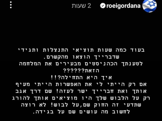 רועי גרודנה תקף בחריפות את השחקנית רבקה מיכאלי. קשר הפועל באר שבע כתב באינסטגרם: "עוד כמה שעות תוציאי התנצלות ותגידי שדברייך הוצאו מהקשרם. לטענתך, הכהניסטים מבעירים את המלחמה הזאת? איך היא התחילה? אם רק הייתה לי אפשרות, הייתי מעיף אותך ואת חברייך ישר לעזה. דרך אגב, שם רק על הלבוש שלך היו מוציאים אותך להורג. זה החוק – על לבוש. לא רוצה לחשוב מה עושים שם על בגידה".