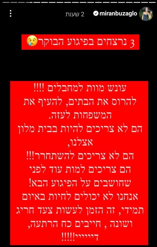 "עונש מוות למחבלים!", זעקה מירן בוזגלו, אשתו של כדורגלן העבר מאור בוזגלו, בעקבות הפיגוע הקשה. "להרוס את הבתים ולהעיף את המשפחות לעזה", המשיכה, "הם לא צריכים להיות בבית מלון אצלנו. הם לא צריכים להשתחרר, הם צריכים למות עוד לפני שהם חושבים על הפיגוע הבא. אנחנו לא יכולים לחיות באיום תמידי, זה הזמן לעשות צעד חריג ושונה – חייבים כוח הרתעה. די!".
