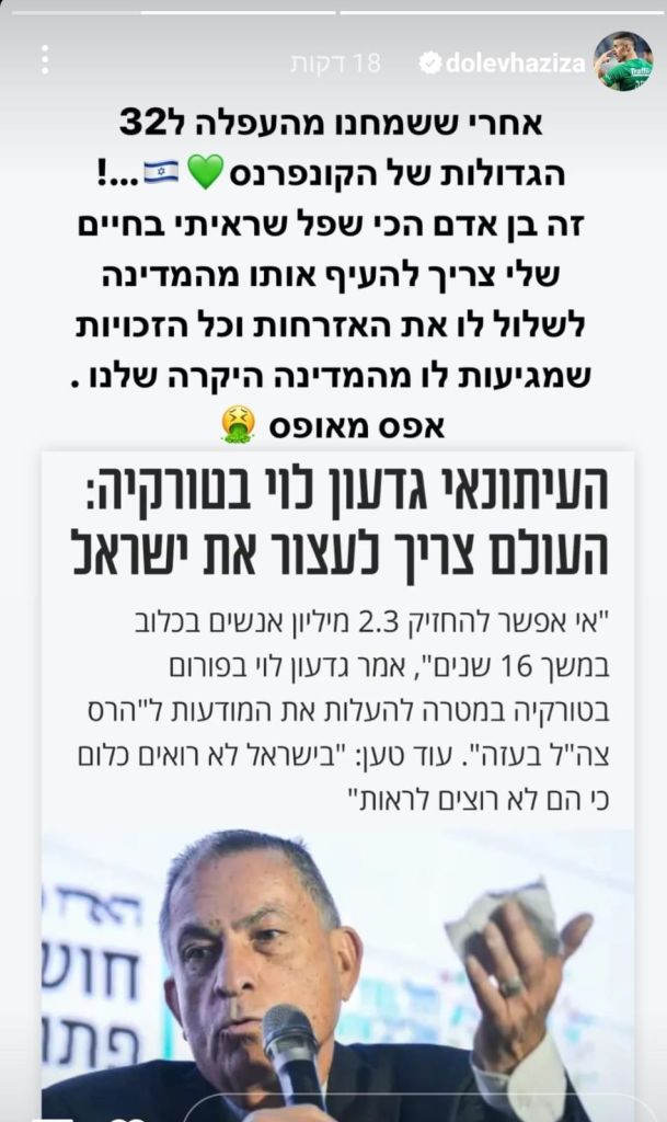הכוכב הפצוע של מכבי חיפה חגג את הניצחון של חבריו ביוון, אך מיהר לצאת בתקיפות נגד דבריו של העיתונאי גדעון לוי: "להעיף אותו מהמדינה ולשלול את האזרחות". אבי נמני: "אין מילה אחרת מלבד בוגד"