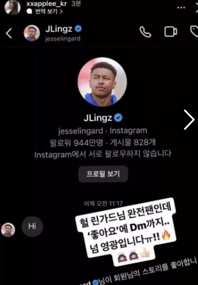 במקביל, נראה שהכדורגלן בן ה-31 מנסה ליצור חברויות ולהתחיל ליהנות גם רחוק מהבית שלו, כפי שחשפה הכוכבת הקוריאנית הענקית שהכינוי שלה הוא "אפלי". נראה שהדוגמנית התרגשה מהעובדה שלינגארד שלח לה הודעה, מאחר והיא שיתפה צילום מסך של ההודעה כולל אייקונים שלו ואפילו תייגה אותו תחת השאלה ששאלה את 1.9 מיליון העוקבים שלה: "האם כדאי שנצא?"