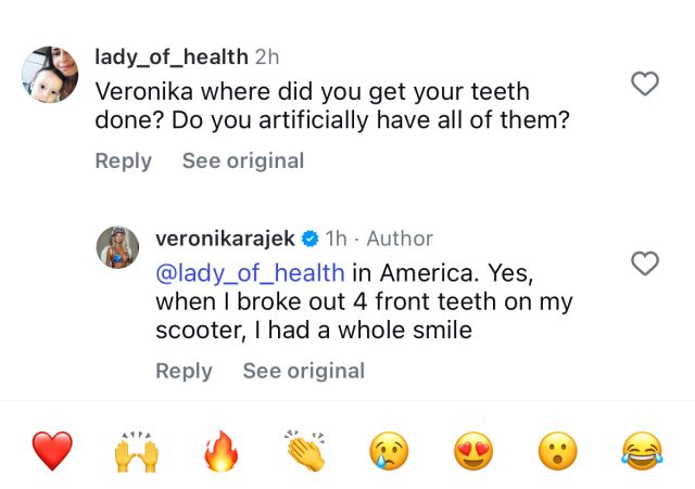 לדוגמנית המתגוררת בלוס אנג'לס, חיוך מושלם ונוצץ, שגרם לאחת העוקבות לשאול אותה האם השיניים שלה טבעיות, ואם לא- עניין אותה לדעת איפה היא עשתה אותן. ורוניקה לא היססה להגיב והשיבה לה: "כן, עשיתי את השיניים שלי כאן באמריקה. שברתי את ארבעת השיניים הקדמיות כשנסעתי עם הקורקינט שלי, אז פשוט החלפתי את כל הלסת העליונה" מה שעזר מאד לחיוך שלה להראות מושלם.