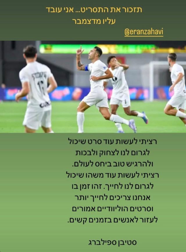 קצב צוטט את הבמאי ההוליוודי סטיבן שפילברג בהקשר ליכולת הפנומנלית של המיוצג שלו: "רציתי לעשות עוד סרט שיכול לגרום לנו לצחוק ולבכות ולהרגיש טוב ביחס לעולם. זהו זמן בו אנחנו צריכים לחייך יותר, וסרטים הוליוודיים אמורים לעזור לאנשים בזמנים קשים". רק כשהניף את הרגל, עוד לפני שכבש את השער השלישי שלו במשחק, רוי רביבו, שמסר לחלוץ הוותיק, כבר הניף ידיים והחל לחגוג. ערן הודה למגן השמאלי והוסיף לחגיגת הסטורי שלו באינסטגרם: "סומך עליי. חוגג לפני".