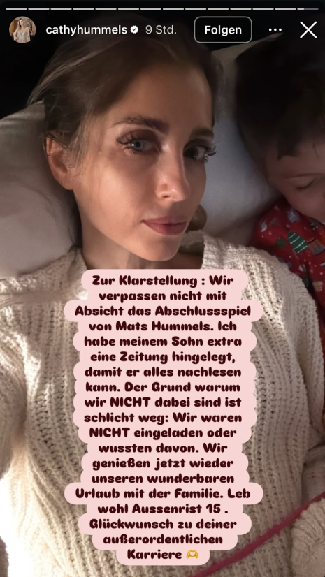 בהודעת המשך מאוחר יותר באותו יום, קתי אישרה שלא הייתה מודעת למשחק הפרידה של הומלס, וטענה שגילתה זאת רק כשקראה את העיתון. היא אישרה כי היא ולודוויג נמצאים בחופשה באגם כימזה בבוואריה. "להבהרה: אנחנו לא מפספסים בכוונה את המשחק האחרון של מאטס הומלס. נתתי לבני עיתון נוסף כדי שיוכל לקרוא הכל", היא כתבה. "הסיבה שאנחנו לא שם היא פשוטה: לא הוזמנו או ידענו על זה. אנחנו נהנים עכשיו מהחופשה הנפלאה שלנו עם המשפחה שוב".
