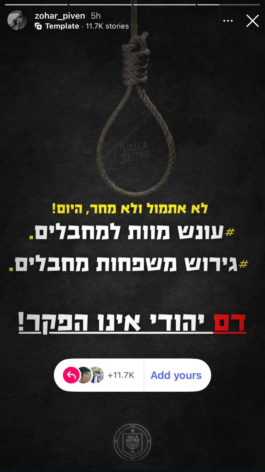 זוהר, אשתו של בלם הפועל תל אביב שחר פיבן, בחרה להביע את עמדתה בצורה חד-משמעית. היום (שלישי) היא שיתפה סטורי שרץ ברשתות החברתיות בשעות האחרונות, וכבר שותף בלמעלה מ-11.7 אלף חשבונות אינסטגרם. בסטורי נכתב: "לא אתמול ולא מחר, היום! עונש מוות למחבלים. גירוש משפחות מחבלים. דם יהודי אינו הפקר!".
