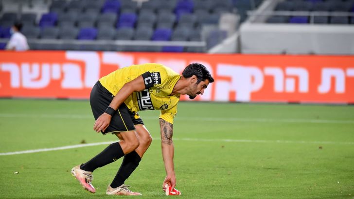 אופיר קריאף שחקן בית"ר ירושלים מוציא חפצים שנזרקו למגרש | אריאל שלום
