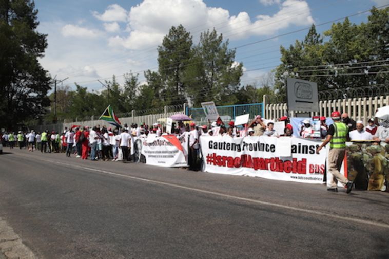הפגנה פרו פלסטינית מתקיימת מחוץ בקאנטרי קלאב אייריני בפרטוריה. ובו נוטלים חלק גם פעילי BDS מקומיים שנושאים שלטים וקוראים קריאות נגד ישראל.