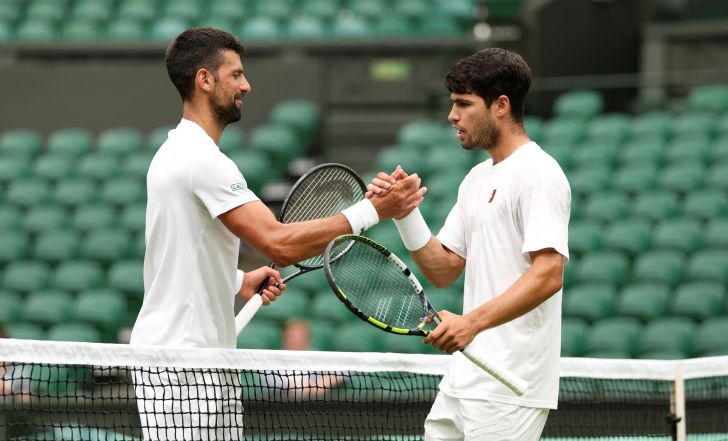 קרלוס אלקראס ונובאק ג'וקוביץ', שנפגשו בשנה שעברה בגמר טורניר ווימבלדון שהסתיים בניצחונו של הספרדי הצעיר, התאמנו היום (חמישי) יחד על הדשא במגרש המרכזי בלונדון.