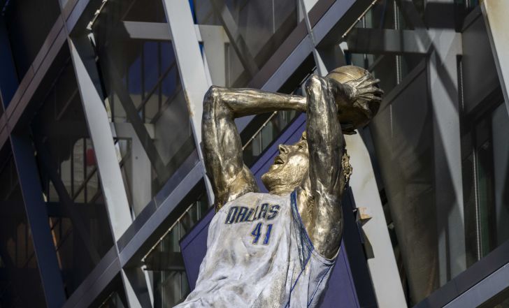 דאלאס חשפה אתמול בלילה (ראשון) את הפסל החדש של דירק נוביצקי מחוץ לאולם שלה, כשהכדורסלן הגרמני זוכה לכבוד הראוי לו על היותו גדול שחקני המועדון והאיש שהביא למאבריקס את האליפות הבלתי נשכחת בעשור הקודם. מדובר בפסל בגובה של 7.5 מטרים, עשוי ברונזה, שבו נוביצקי מוצג קולע את הקליעה הייצוגית הקלאסית שלו – פיידאוויי, על רגל אחת, בעודו נשען לאחור, לא מותיר סיכוי לשומר שמולו.