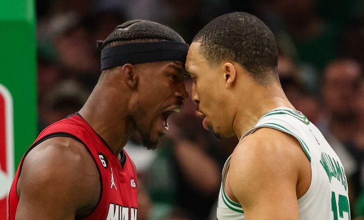 שחקן מיאמי היט ג'ימי באטלר ליד שחקן בוסטון סלטיקס אל הורפורד | אימג'בנק GettyImages, Adam Glanzman
