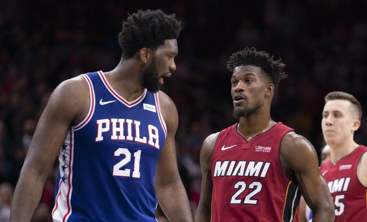 שחקן פילדלפיה 76' ג'ואל אמביד עם שחקן מיאמי היט ג'ימי באטלר