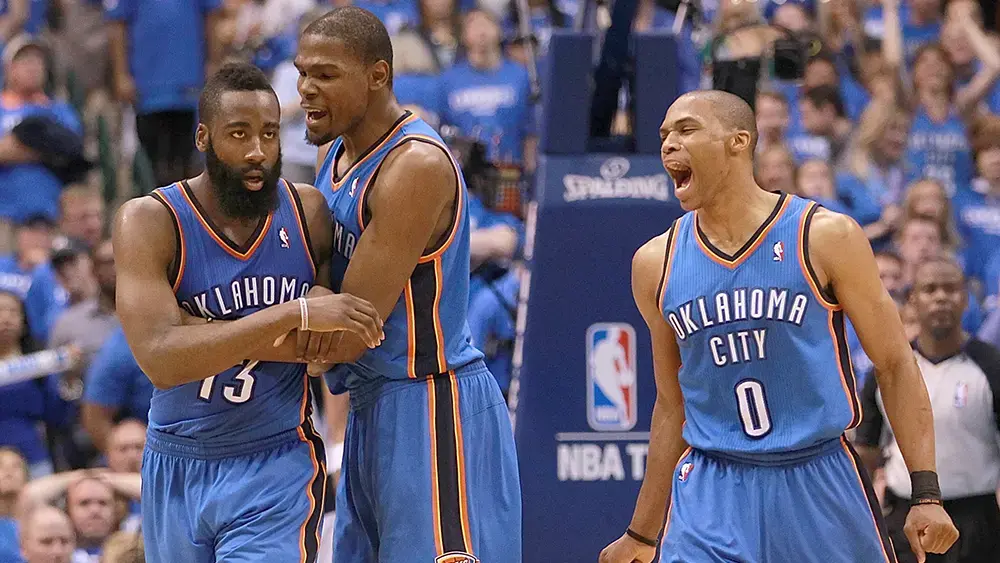 ראסל ווסטברוק, קווין דוראנט, ג'יימס הארדן במדי אוקלהומה סיטי ת'אנדר | GettyImages