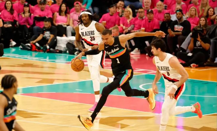 ויקטור וומבניאמה המשיך לפרפר את ההגנה של פורטלנד, אבל שלשות של ג'רמי גראנט וטומאני קמארה שמרו על פורטלנד בתמונה, כשהאורחים צימקו ל-36:31 – אבל דווין ואסל בשלשה העניק לספרס יתרון דו ספרתי ראשון, 31:41, שגרם לסלפליטר להזעיק פסק זמן 7:23 דקות לסיום הרבע.