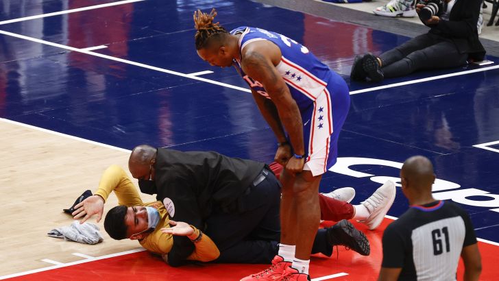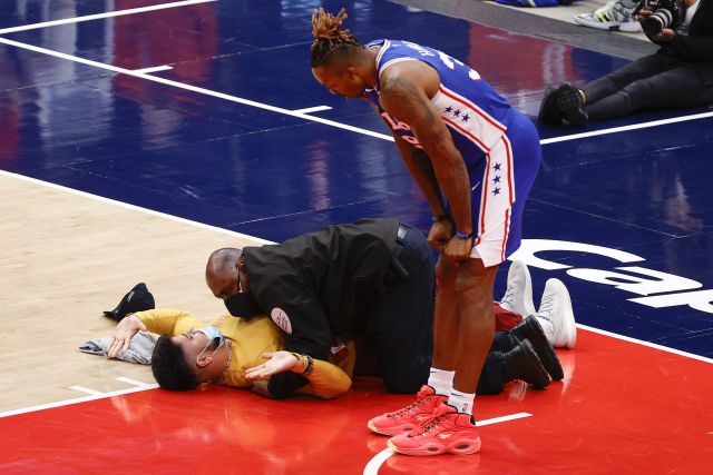 אוהדי הכדורסל באולמות ה-NBA ממשיכים להשתולל. הלילה (בין שני לשלישי) במהלך המשחק בין וושינגטון וויזארדס לפילדלפיה 76', אוהד הקבוצה מבירת ארצות הברית פרץ לשטחי המגרש וקפץ כדי לגעת בלוח הסל, לפני שתוקל על ידי אחד המאבטחים ב"קפיטל וואן ארנה".