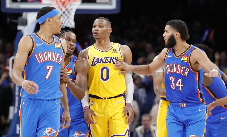 אחרי שהסתדרה בלי לברון ג'יימס וגירדה ניצחון על סן אנטוניו, הלייקרס נחלה הלילה הפסד מביך במיוחד בלי הכוכב שלה שישב משחק נוסף בחוץ בגלל פציעה. OKC, אולי הקבוצה הכי חלשה בליגה הגיעה למשחק הזה במאזן של 4:0 ובעיקר הובסה עד כה, אבל הצליחה לחזור מפיגור של 41:19 כבר ברבע הראשון, עם התפוצצות של 23:41 ברבע השלישי המצוין שלה. אחרי שהוביל אותה לניצחון על הספרס, ראסל ווסטברוק רשם אומנם טריפל דאבל של 20 נקודות, 14 ריבאונדים ו-13 אסיסטים, אבל גם "תרם" 10 איבודים. אנתוני דייויס הוביל עם 30 נקודות ו-8 ריבאונדים, כשכרמלו אנתוני ואייברי בראדלי תורמים 13 מהספסל, אבל גם זה לא הספיק ללייקרס שגם עם לברון נראים כרגע רע מאוד ולא כמו קבוצה שיכולה להיאבק על האליפות וגם לזכות בה כמו לפני שנתיים. בצד השני, שיי גילג'ס אלכסנדר, הכוכב היחיד שנותר בקבוצה הזו, הוביל כרגיל עם 27 נקודות ו-9 ריבאונדים. דאריוס באזלי הוסיף 20 וסייע לקבוצתו להשיג ניצחון בכורה.