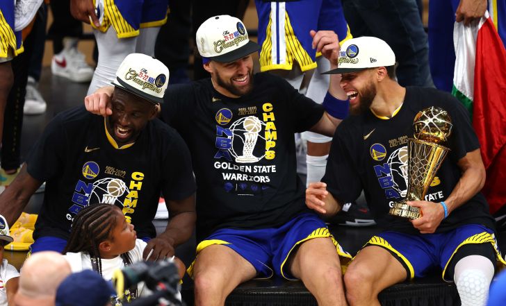 סטפן קרי, דריימונד גרין, קליי תומפסון: שלושת כוכבי גולדן סטייט ווריירס חוגגים זכייה באליפות ה-NBA, יוני 2022