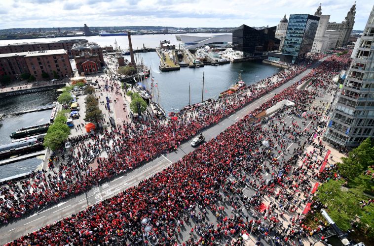 Liverpool fans gather in their thousands in the city for their parade today. #LFCpic.twitter.com/Z5Cj2igXQC
