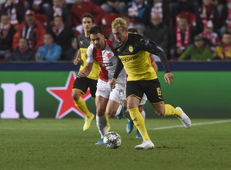 דורטמונד בפתיחת המשחק על רקע תצוגת הקהל של סלביה פראג (Sebastian Widmann/Getty Images)