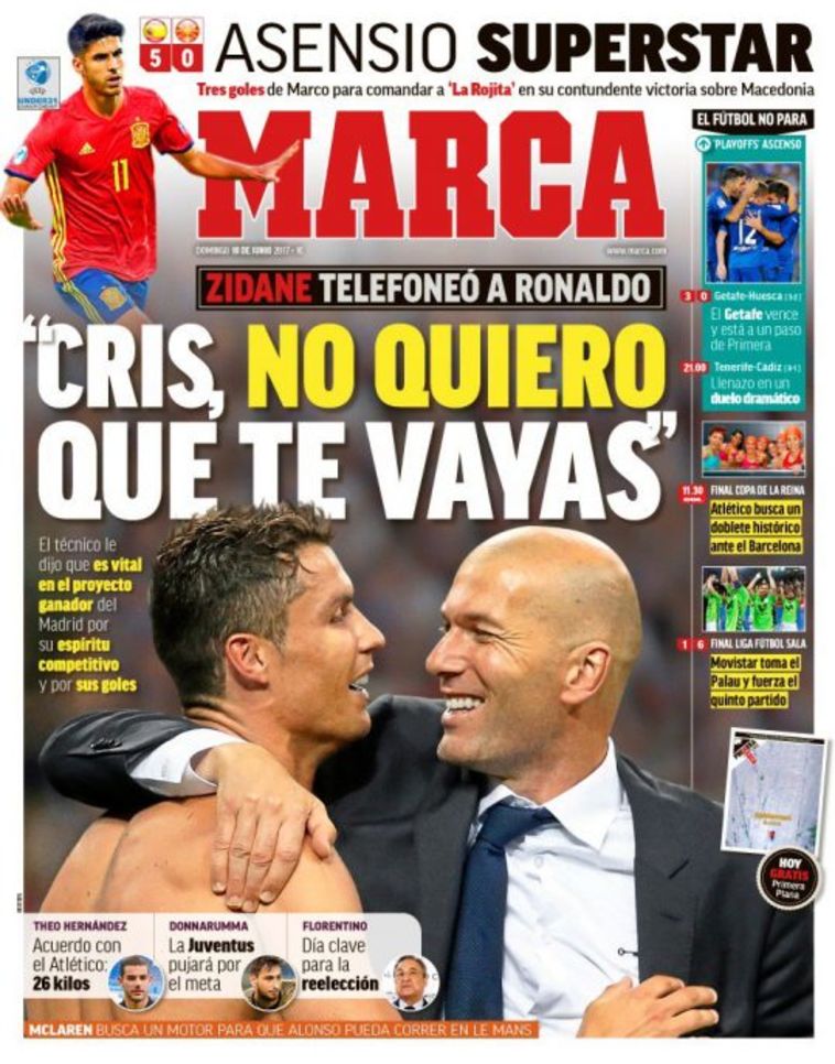 תחילה הדיווחים היו רגועים יותר, ראשי הבלאנקוס טענו כי הנשיא פלורנטינו פרס ייפגש עם הפורטוגלי והאווירה תירגע והכל יחזור לקדמותו, אלא שהעיתון "מארקה", הידוע לרוב באמינותו בכל הנוגע לריאל מדריד, פרסם היום בשער על שיחה שנערכה בין CR7 למאמן זינדין זידאן. לפי אותו דיווח, זיזו התקשר לרונאלדו וביקש: "כריס, אני לא רוצה שתעזוב". מאוחר יותר דווח שהפורטוגלי ענה למאמן: "אני עוזב כי מתייחסים אליי בספרד כמו לפושע".