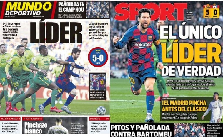 ב"מארקה" נכתב: "כשמסי רואה את ריאל מדריד באופק – זה מה שקורה". "מסי מנפץ את תקוותיה של אייבר. הוא החליט, וכך זה קרה. תוך חצי שעה בערך השחקן הטוב בעולם פירק את אייבר בהצגה מסנוורת", נכתב ב"מונדו דפורטיבו". "מוליכה", נכתב בשער העיתון. ב"ספורט" נכתב במשחק מילים מתאים "המוליכה הייחודית" על רקע תמונה של מסי כמובן, שם לא שכחו לעקוץ את ריאל מדריד. "רביעייה של אלוף", נכתב באתר שם הוסיפו כי ריאל מדריד החזירה את השמחה לקאמפ נואו לאחר שבוע של משבר