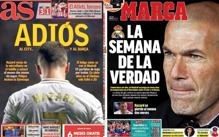 ב-"אס" הייתה תמונה של אדן הזאר מאוכזב עם הכיתוב "להתראות" כשבצדדים התייחסו למשחקים נגד סיטי ובארסה. אין ספק שהבלגי שהיה הרכש היקר בהיסטוריה של ריאל מדריד הפך לפלופ. הסטטיסטיקה שלו אכזרית. במדי ריאל העונה הוא רשם 15 הופעות אל מול 19 משחקים שהחמיץ בשל פציעה, בזמן שבכל שבע השנים שלו באנגליה במדי צ'לסי (2012-2019) החמיץ רק 20 משחקים בשל פציעה.