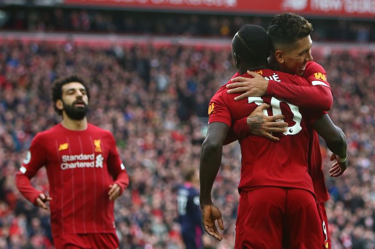 שחקני החוד של ליברפול חוגגים (GEOFF CADDICK/AFP via Getty Images)