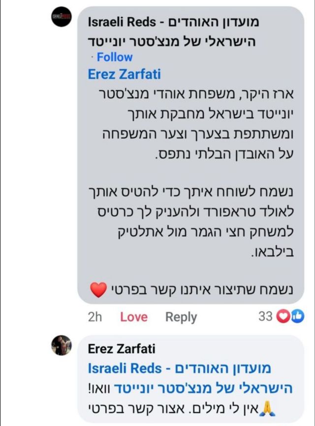 ארז צרפתי, אביה של רון צרפתי הי"ד שנרצחה באכזריות במסיבת הנובה ב7.10, חשף באחת התגובות לפוסט המדובר, כי מאז אותו היום הוא פשוט לא הצליח לצפות בכדורגל, ובמיוחד בקבוצתו האהובה משכבר הימים – מנצ'סטר יונייטד.