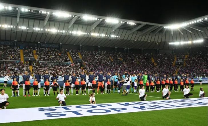 השלט הוצג מול הקבוצות לפני שריקת הפתיחה באצטדיון פריולי באודינה, איטליה, ולהערכת כלי התקשורת באירופה, התזמון אינו מקרי. "המחווה מגיעה ימים ספורים לאחר שמוחמד סלאח ביקר את אופ"א על כך שלא ציינה את ישראל במחוותה ל'פלה הפלסטיני'", נכתב ב"טלגרף" האנגלי, כאשר לכולם ברור: המסר מופנה לישראל.