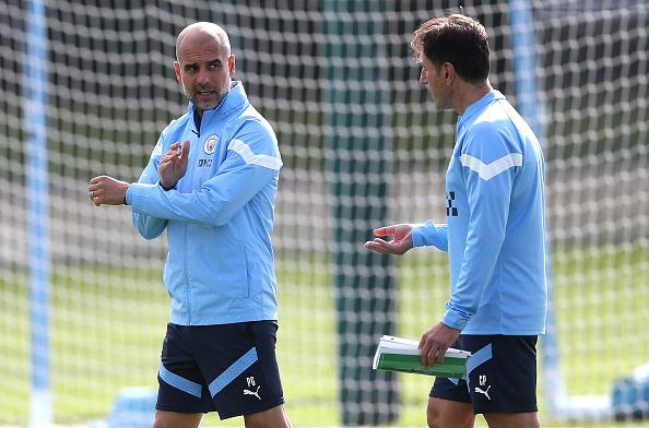 קרלס פלנשארט ופפ גווארדיולה במהלך אימון במנצ'סטר סיטי | Barrington Coombs – PA Images