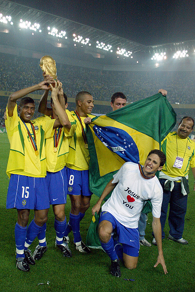 קלברסון (מספר 15) עם גביע העולם שזכתה נבחרת ברזיל ב-2002 | Richard Sellers/Allstar
