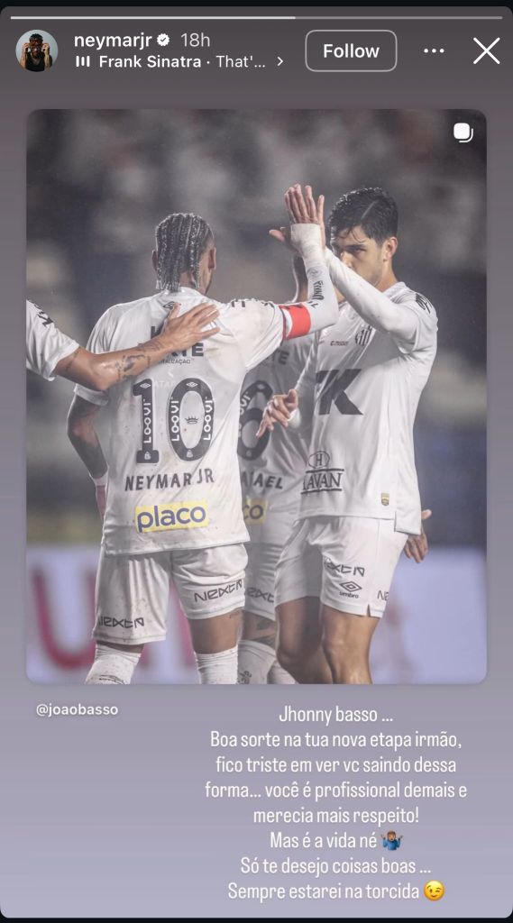 ניימאר ובאסו פיתחו קשר קרוב מאז חזרתו של הכוכב למועדון נעוריו, ובסטורי שפרסם לעשרות מיליוני עוקביו באינסטגרם כתב: "ג'וני באסו. בהצלחה בשלב החדש שלך, אחי. עצוב לי לראות אותך עוזב בצורה הזאת. אתה מקצוען מדי והגיע לך יותר כבוד! אבל אלה החיים, נכון. אני מאחל לך רק דברים טובים. תמיד אהיה בעדך".