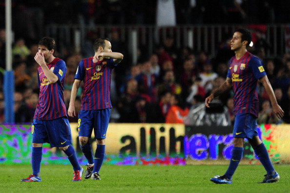טיאגו אלקנטרה, אנדרס אינייסטה וליאו מסי במדי ברצלונה | gettyimages
