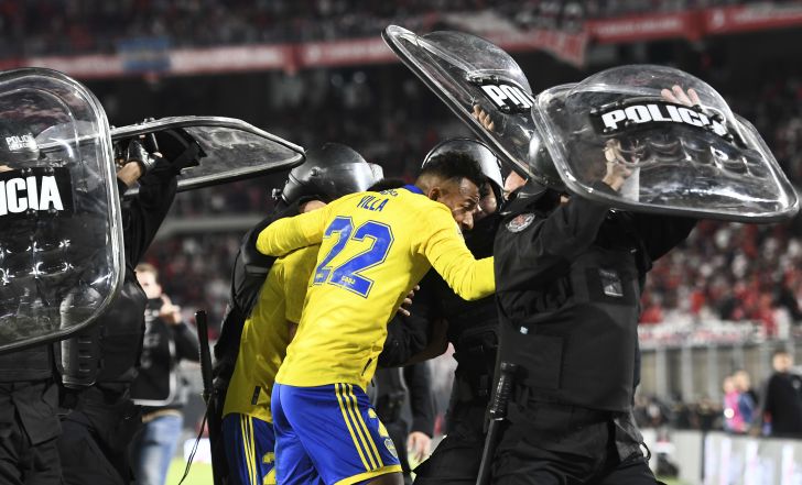 שחקני בוקה ג'וניורס יורדים מהמשחק נגד ריבר פלייט בליווי משטרתי