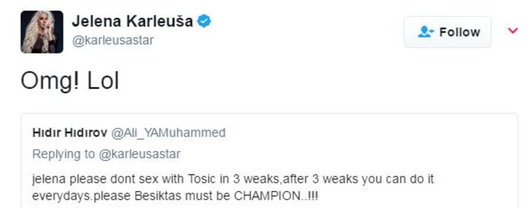 ילנה קרלסואה בת ה-38, זמרת פופ מצליחה בסרביה, העלתה לחשבון הטוויטר שלה צילום די פרובוקטיבי ומיד זכתה לתגובות – ואחת מהן אף זכתה להתייחסותה. "בבקשה אל תשכבו בשלושת השבועות הבאים, אחר כך תעשו את זה בכל יום. בבקשה, בשיקטאש צריכה לזכות באליפות!!!"