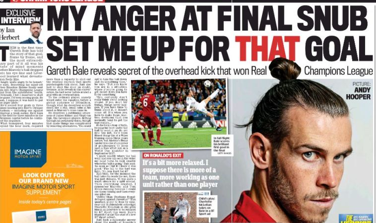 בייל כזכור, נכנס רק כמחליף בגמר בקייב וכאמור כבש פעמיים נגד ליברפול. כשנשאל על כך שפתח את המשחק על הספסל ענה: "כעסתי, אם לומר את אמת הייתי די כעוס. ברור שהרגשתי שאני צריך לפתוח במשחק והגיע לי כי כבשתי שערים באותה תקופה. כן, היה לי די קשה לשים את הכעס הזה בצד".